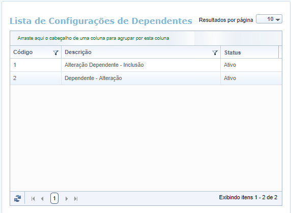 Ao abrir essa funcionalidade, é apresentada uma relação das Configurações de dependentes já cadastradas: