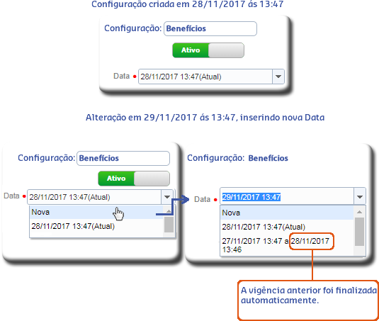 Ao alterar algum dado da configuração e informar uma nova Data, inicia-se uma nova vigência encerrando a anterior.