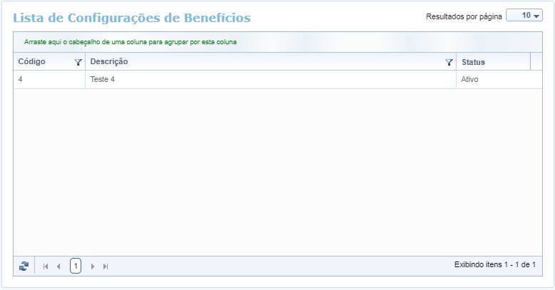 Ao abrir essa funcionalidade, é apresentada uma relação das Configurações de Benefícios já cadastradas: