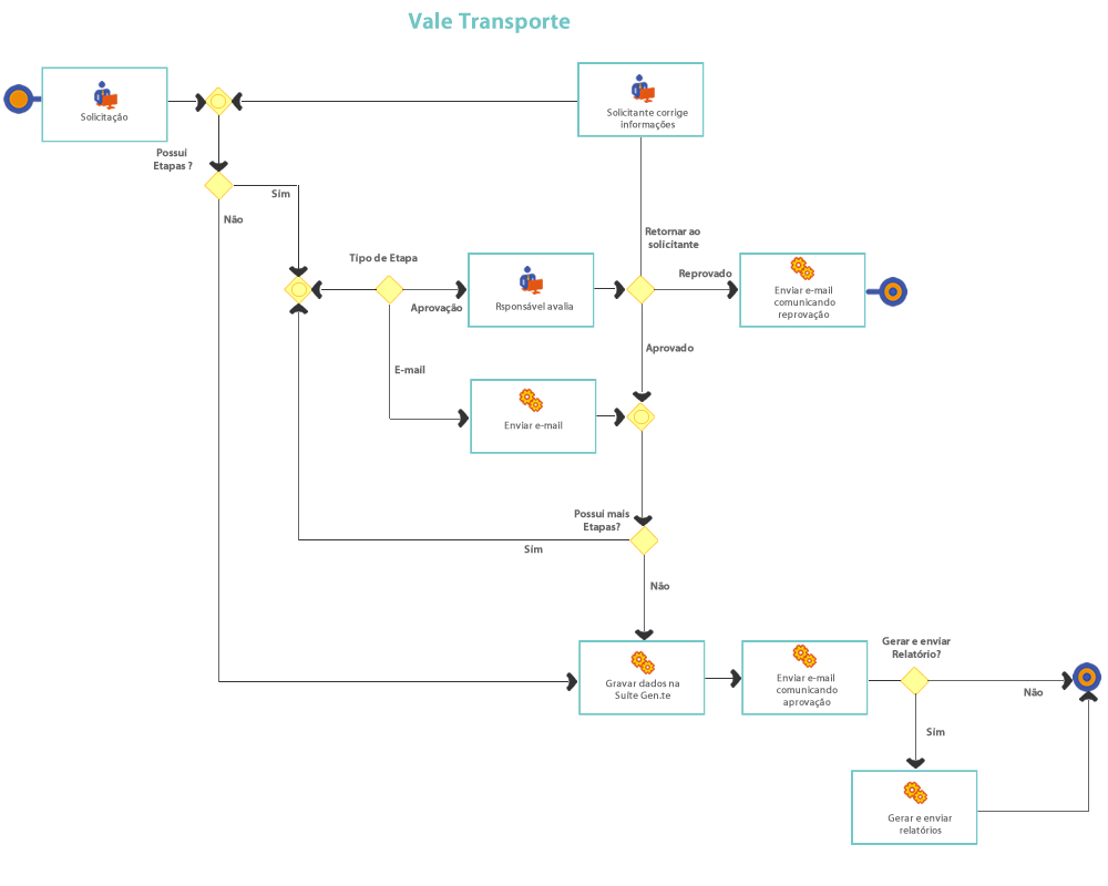 Solicitação Etapas Aprovação Etapa de email Enviar email Solicitação Enviar email de aprovação Gerar e enviar relatórios