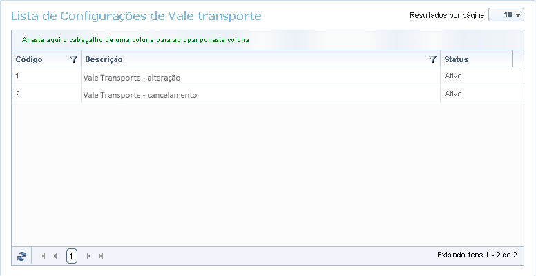 Ao abrir essa funcionalidade, é apresentada uma relação das Configurações de vale transporte já cadastradas: