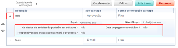 Ao selecionar as opções Grupo de colaboradores ou Pessoas do grupo de colaboradores, é apresentada a opção Impedir que o Alvo do processo realize a aprovação, caso ele participe do grupo de colaboradores responsável?. A opção quando marcada como Sim, permite ao sistema impedir que o solicitante, caso este faça parte do grupo de colaboradores do processo, aprove sua própria solicitação. Caso a opção esteja marcada como Não, permite ao solicitante realizar a aprovação da etapa.