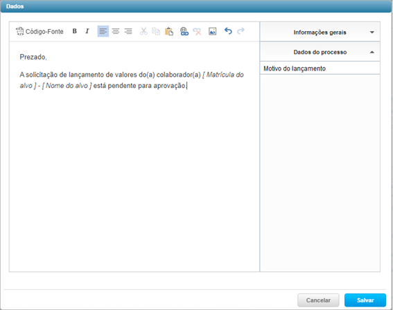 Nesta guia defina como será o envio dos e-mails de Pendência, Aprovação e Reprovação para o processo de lançamento de valores.