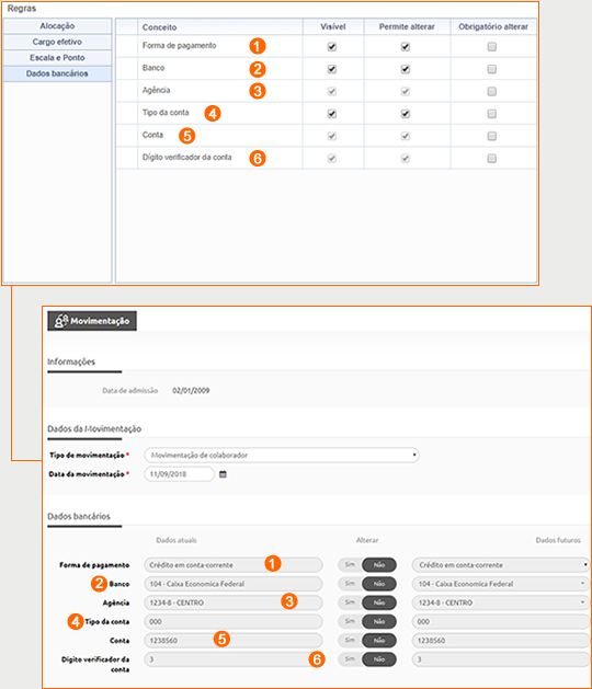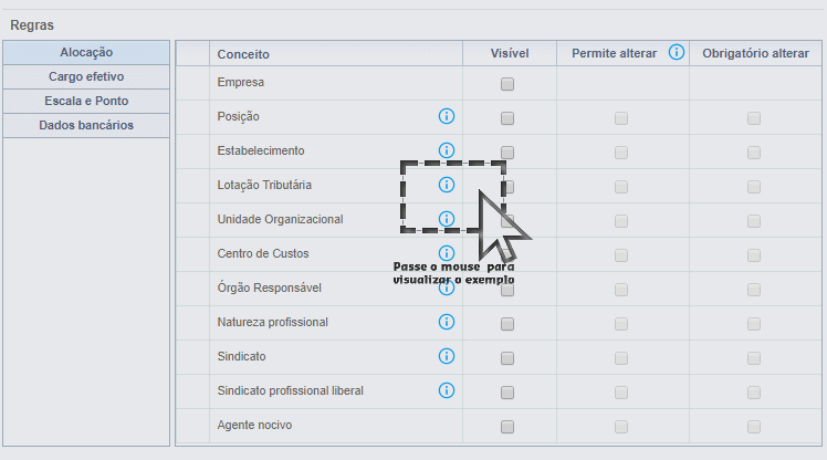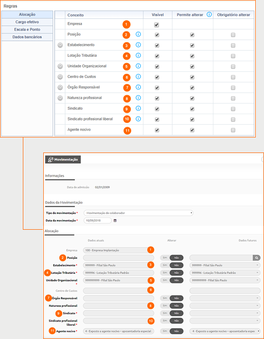 Alocação - será possível disponibilizar no formulário de solicitação de movimentação os seguintes conceitos: Empresa, Posição, Estabelecimento, Lotação Tributária, Unidade Organizacional, Centro de Custos, Órgão Responsável, Natureza profissional, Sindicato, Sindicato profissional liberal, Agente nocivo e Modalidade Contratual.