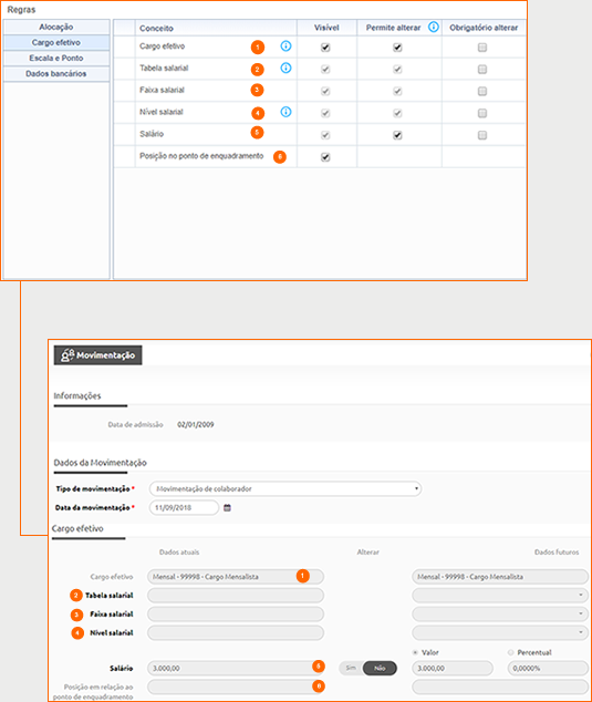 Cargo efetivo - será possível disponibilizar no formulário de solicitação de movimentação os seguintes conceitos: Cargo efetivo, Tabela salarial, Faixa Salarial, Nível salarial, Salário e Posição no ponto de enquadramento.