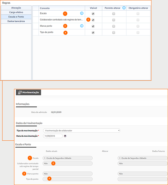 Escala e Ponto - será possível disponibilizar no formulário de solicitação de movimentação os seguintes conceitos: Escala, Colaborador contratado sob regime de tempo parcial, Marca ponto e Tipo de ponto.