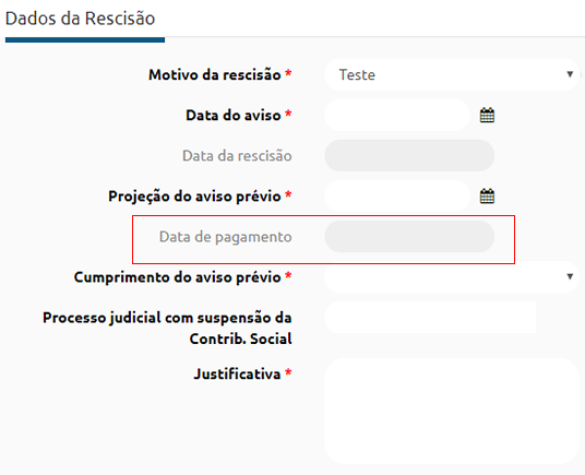 O campo Data de pagamento respeita as configurações informadas na funcionalidade Configurações por Empresa guia Rescisão / Aviso Prévio e será calculada automaticamente pelo sistema mesmo que não seja visível.