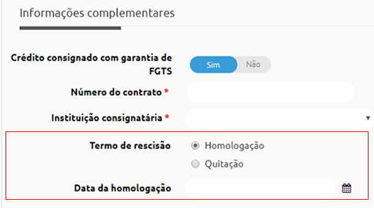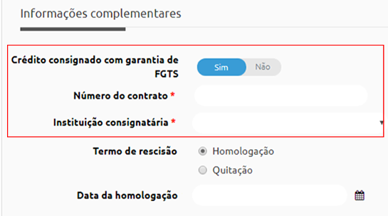 Disponibilizar campos de 'Crédito Consignado com Garantia de FGTS'? - marcando esta opção, na solicitação de rescisão será possível ao solicitante informar se o colaborador possui crédito consignado com garantia de FGTS. Uma vez marcada, as opções Número do contrato e Instituição consignatária são de preenchimento obrigatório.