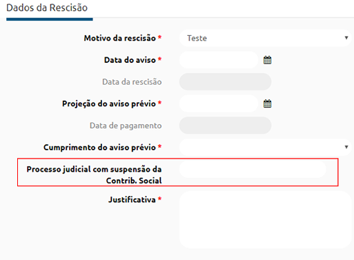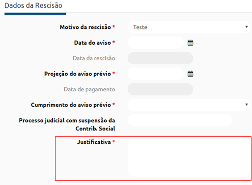 Justificativa obrigatória? - ao marcar esta opção na solicitação de rescisão será disponibilizado um campo para que seja informado uma justificativa para a rescisão, esta é uma informação obrigatória e é apresentada da seguinte maneira: