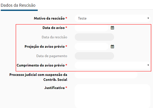 Se o colaborador possuir uma ocorrência de Aviso Prévio não cancelada, o campo Data da rescisão será apresentado com a Data de previsão da rescisão conforme ocorrência de Aviso Prévio e poderá ser alterada, caso o operador deseje.