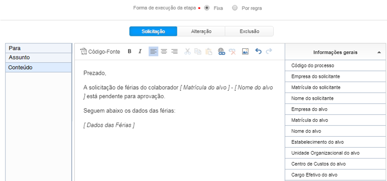 Assunto e Conteúdo que estarão disponíveis no corpo do e-mail através das Informações gerais.