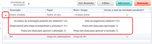 O Papel do responsável pela aprovação, podendo ser: Solicitante, Gestor do alvo, Gestor do solicitante, Grupo de colaboradores, ou Pessoas do grupo de colaboradores.