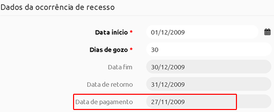 Exemplo: Se o recesso iniciar em 05/01/2025, e a data de pagamento configurada para a referência 01/2025 for definida para o dia 05/02/2025, a data para o pagamento do recesso será 05/02/2025.