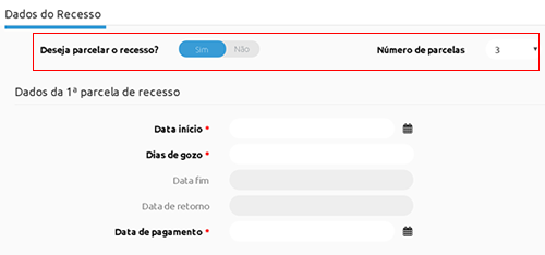 Permitir solicitar parcelas de recesso individualmente? - ao marcar esta opção, quando houver parcelamento de recesso, será possível realizar uma solicitação da primeira parcela sem precisar de programar as outras parcelas em uma solicitação.